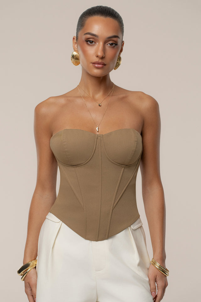 Our Tan Sunset Tides Corset was made for warm days, layered looks, and everything in between. Designed with bra padding, structured seams, and hook and eye closures, this strapless corset offers a tailored fit that beautifully accentuates the waist. Perfectly versatile, it's the perfect piece for any summer occasion. Double-lined. Pair with our Belted Cargo Shorts for the full look. Minimal stretch.